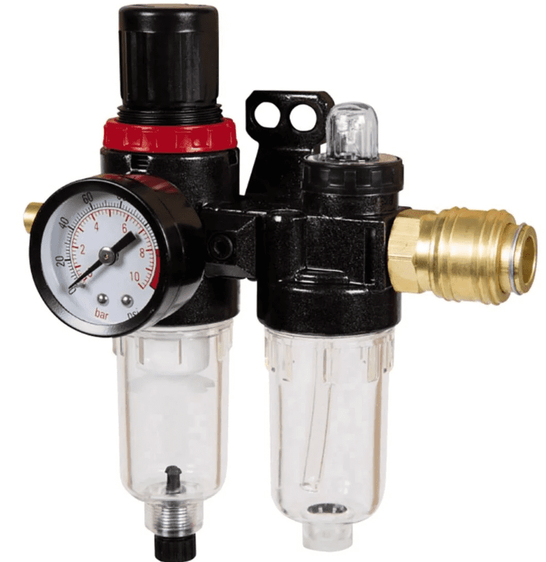 Za regulaciju radnog pritiska ugrađen je manometar. Ulazni tlak je maksimalno 10 bara, podesivi raspon tlaka je do 8 bara. Kombinirana jedinica za održavanje R 1/4 inča s podmazivačem iz Einhella idealna je za opskrbu čistim, suhim i reguliranim komprimiranim zrakom. Regulirani tlak potreban je za mnoge zračne alate, koji mogu pravilno raditi samo pri određenom radnom tlaku. Prikladna za većinu poslova održavanja alata na komprimirani zrak. Jedinica za održavanje uklanja krute čestice i kondenziranu vlagu iz komprimiranog zraka. Protok zraka se može precizno kontrolirati pomoću kontrolnog ventila.