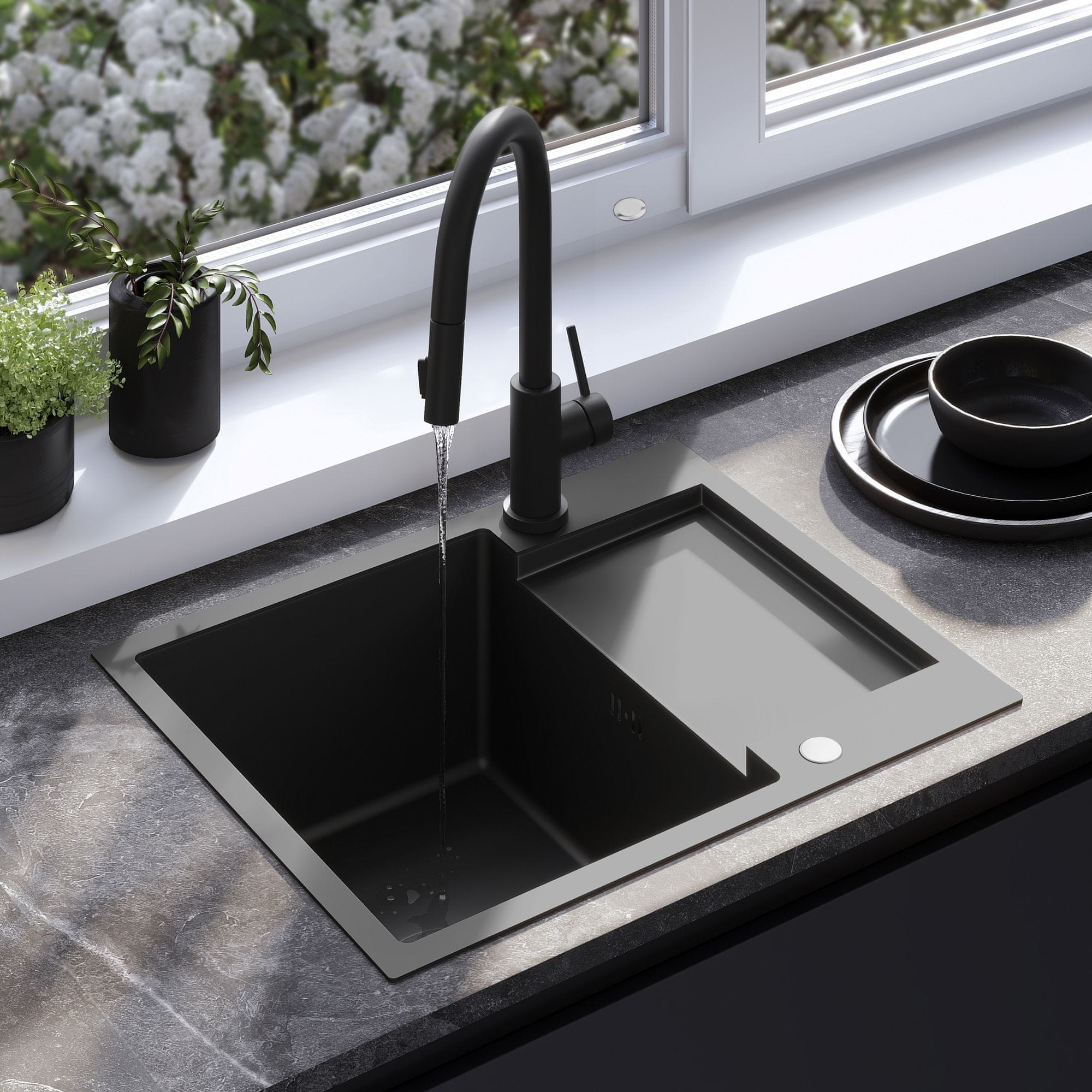 Sudoper s kuhinjskom slavinom svojim minimalističkim, modernim izgledom uklapa se u aranžman svake kuhinje. Nadopunjen slavinom s fleksibilnim izljevom stvara potpunu radnu površinu u mokroj zoni. Proizvod ima odvod u istoj nijansi, što čini cjelinu vrlo koherentnom i elegantnom. Sifon koji dolazi u kompletu sa sudoperom je praktičan model tipa „štednja prostora“. Zahvaljujući rasporedu odvodnih cijevi, ispod sudopera može se dobiti dodatni prostor za pohranu ambalaže s deterdžentima ili spremnika za smeće. Higijenski materijal i lakoća čišćenja glatkih površina čine da sudoper zadržava besprijekoran izgled i otežava mogućnosti razvoja mikroorganizama.Potonuti: ZlewozmywakDuljina sudopera (mm): 600Širina sudopera (mm): 480Dubina odjeljka sudopera (mm): 185Otvor za slavinu: DaMaterijal: Nehrđajući čelikBoja: BlackZajedno