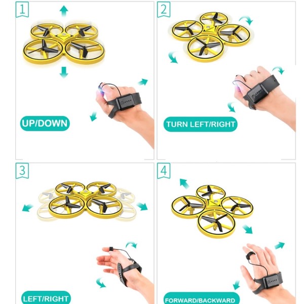2. Rotacija: Pritisnite gumb na prstu. Dron će se okretati u skladu s rotacijom ruke.
