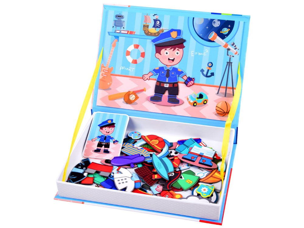 Kutija s muškim zanimanjima je set od 59 magnetskih odjevnih predmeta i dodataka za oblačenje modela, od kojih možete stvoriti nogometaša, vrtlara, građevinara itd. Fantastičan kreativni set u tvrdoj kartonskoj kutiji koja imitira knjigu. Set zanimanja omogućuje djetetu da samo odabere odjeću modela, ali može također koristiti upute na karticama na kojima su dječaci u odjeći prilagođenoj određenom zanimanju.