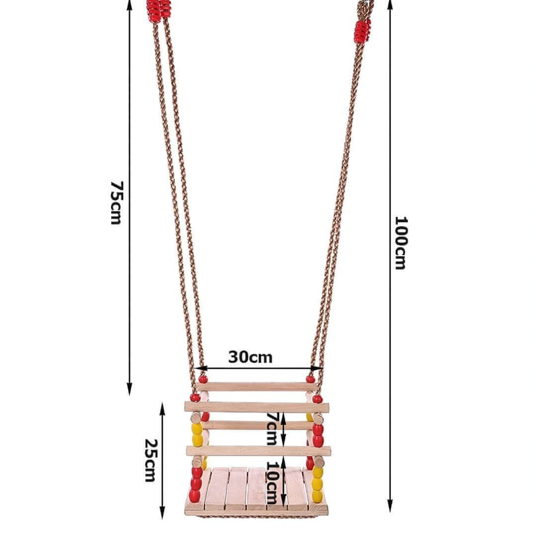 Drvena ljuljačka je izrađena od visokokvalitetnog sirovog drva, koje je brušeno i glatko. Izdržljive užadi i sigurnosna ograda osiguravaju stabilnost i sigurnost tijekom ljuljanja.