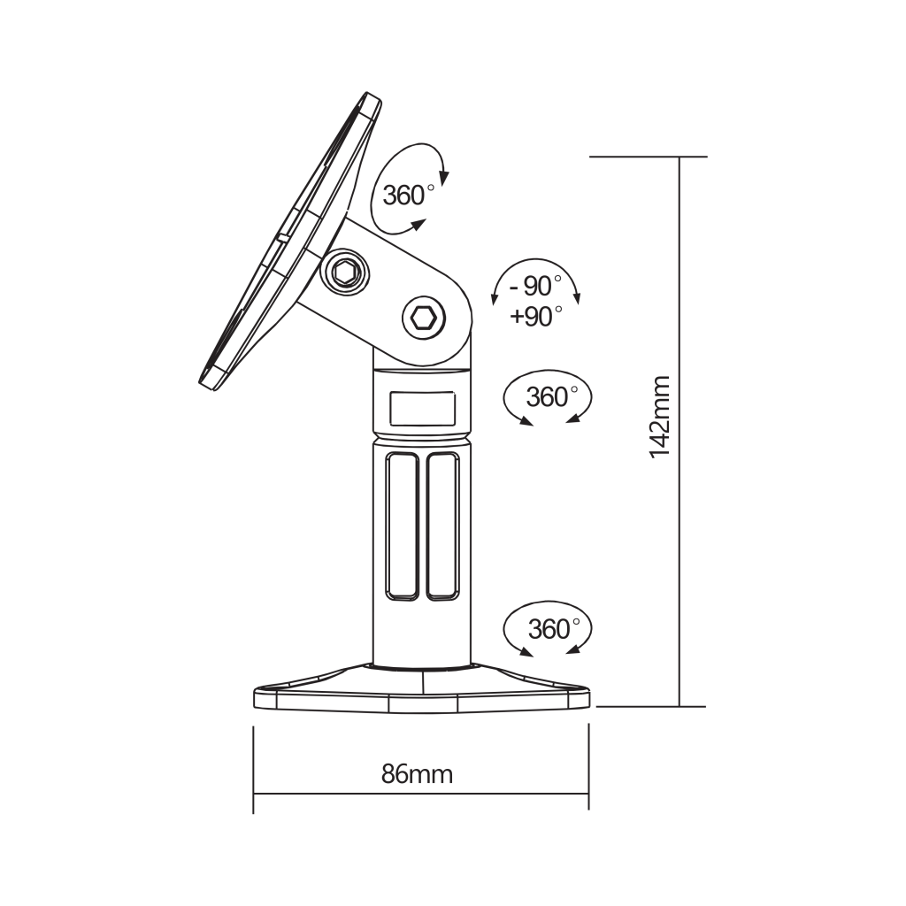 Vrsta montaže: Zidni nosač za zvučnike Maksimalno opterećenje (kg): 3,5 kg/stalak Vertikalni nagib: ± 90° Zakretanje: 360° + 360° + 360° Materijal: Plastika Površinska obrada: Praškasti premaz Dimenzije (mm): 142×86×45 Udaljenost od zida (mm): 142…