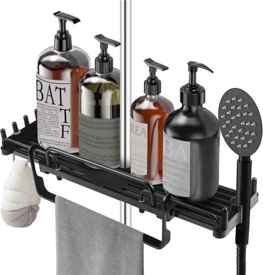Nikcorp Tuš polica bez bušenja, teleskopska, podesiva visina za tuš šipku 18-26mm, aluminijska s kukicama, crna