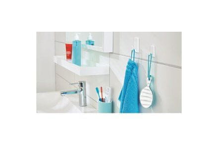 univerzalne samoljepljive tesa Powerstrips® kuke – pravokutne izrađene od visokokvalitetne plastike upotreba u kupaonici ili kuhinji za vješanje kozmetike i alata izravno u tušu ili blizu kade.