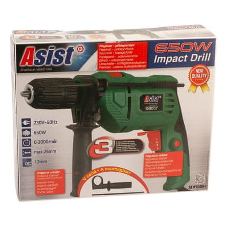 Ulazna snaga: 650 W Napajanje: 230 V Brzina bez opterećenja: 0–3000/min 13 mm – čelik 25 mm – drvo 16 mm – beton Stezna glava: 13 mm