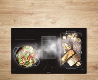 Gorenje AreaFlex HET949BSC je indukcijska ploča za kuhanje s napom, modernog minimalističkog izgleda. Ploča je lijepa i praktična. Dizajn omogućuje jednostavno i brzo čišćenje. Filter za masnoću jednostavno uklonite i operite sve dijelove u perilici posuđa. Ploča za kuhanje ima dvije okomite ploče za kuhanje za ravnomjerno kuhanu ili pečenu hranu u većim loncima i tavama. Površina je potpuno ravna i izrađena od visokokvalitetnih materijala s preklopima od nehrđajućeg čelika.