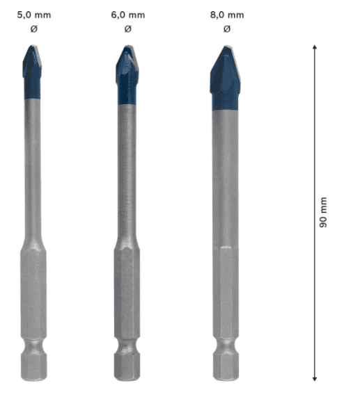 Svrdla imaju Bosch Carbide tehnologiju i posebno dizajniran vrh za centriranje. Omogućuje učinkovito bušenje tvrdih materijala.