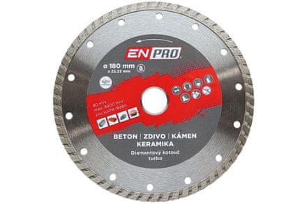 - Dijamantne ploče premium marke ENPRO, što je jamstvo profesionalne kvalitete. ENPRO ploče se prvenstveno ističu visokom kvalitetom korištenog materijala i dugotrajnom izdržljivošću. MPA certifikat. Turbo ploče se koriste za rezanje raznih vrsta materijala kao što su: beton, zidanje, kamen, keramika, granit, mramor. Turbo ploče su idealan izbor za kombinaciju između segmentne i kružne ploče. Pružaju glatki rez i mogu se koristiti za mokro i suho rezanje.