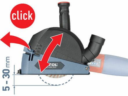 Ispušna napa/adapter za rezanje kutnom brusilicom, ?115/125 mm unaprijed postavljeni položaji zaključavanja određuju rezanje materijala: za disk promjera 125 mm rez je 5–30 mm, a za disk promjera.