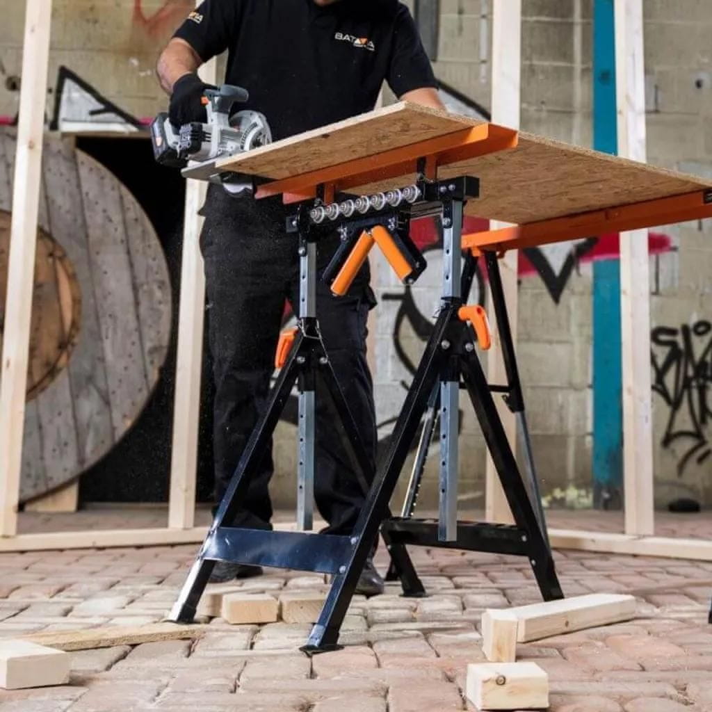 Dvije donje prečke imaju rupe za umetanje alata. Kada više ne trebate nosiljku, možete je jednostavno složiti i spremiti kako biste uštedjeli prostor. Produljive šipke za podešavanje visine su pocinčane, a noge okvira su premazane prahom. Zahvaljujući robusnom dizajnu, nosač ima maksimalnu nosivost od 200 kg, kotačići i kuglični kotači mogu se opteretiti do maksimalno 100 kg, a V-kotači imaju maksimalnu nosivost od 45 kg.