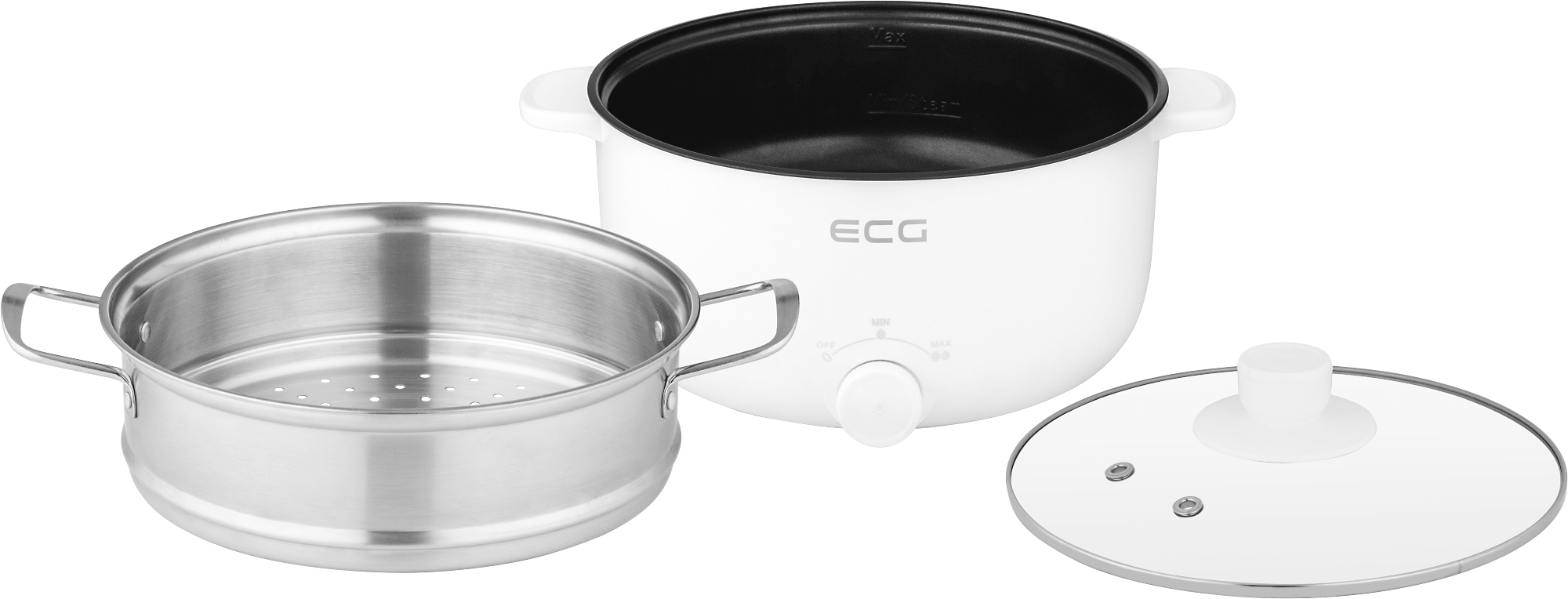 Električni lonac zapremine 3 litre pogodan je za kuhanje juha i umaka. ECG EH 1886 Double ima unutarnji lonac od nehrđajućeg čelika s neprianjajućom površinom, posudu za kuhanje na pari od nehrđajućeg čelika i stakleni poklopac. Možete birati između 2 snage kuhanja.