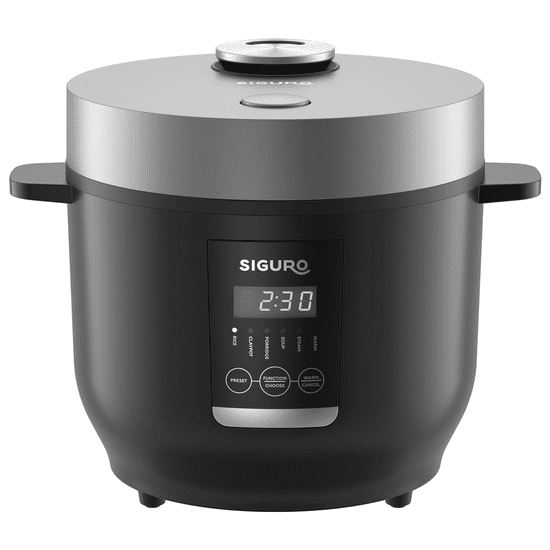 Rizovar Siguro RC-R700B Rice Master Digital Black kod kuće priprema ne samo savršenu rižu, već može i mnogo više. 6 preddefiniranih programa omogućuje pripremu riže, juha, kaša i popularne Claypot riže. U paketu je i parni koš, tako da lako pripremite povrće ili ribu na pari. Upravljanje je jednostavno zahvaljujući tipkama osjetljivim na dodir i preglednom zaslonu. Dovoljno je dodati do 600 g sirove riže bilo koje vrste, uliti vodu i odabrati program RICE. Nije potrebno miješati i ništa se ne zapeče. Aluminijska posuda ravnomjerno raspoređuje toplinu i ne lijepi se. Dok se riža priprema, možete se posvetiti drugim zadacima i za nekoliko minuta imate gotov obrok bez stresa i nepotrebnog pranja posuđa.