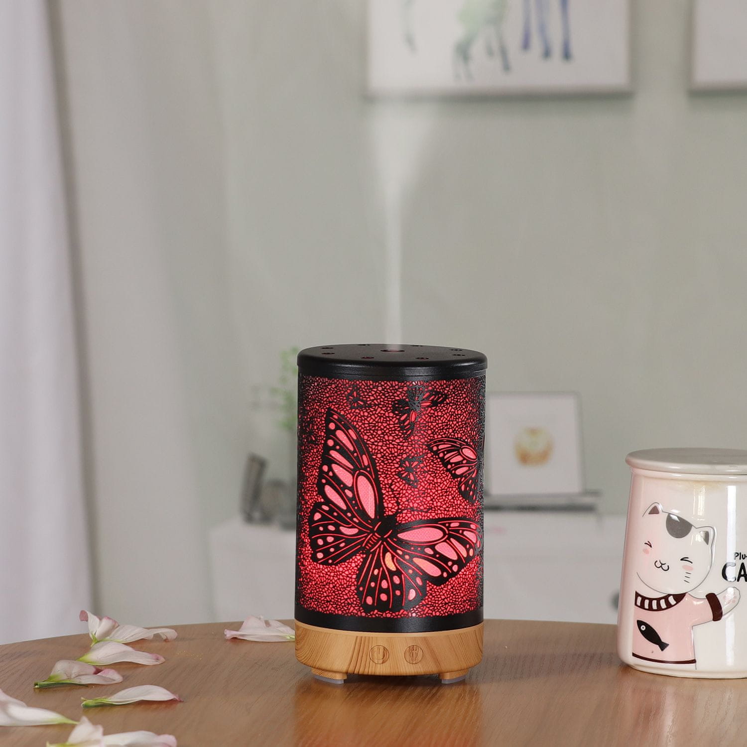 Skinite gornji poklopac difuzera, ulijte dovoljno vode i dodajte nekoliko kapi mirisnog ulja po želji. Difuzer možete upravljati daljinskim upravljačem, postaviti boju svjetla, tajmer, jačinu maglice i druge funkcije.