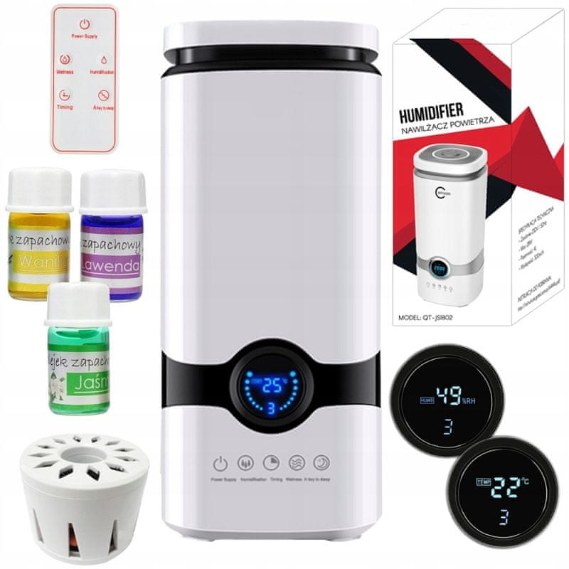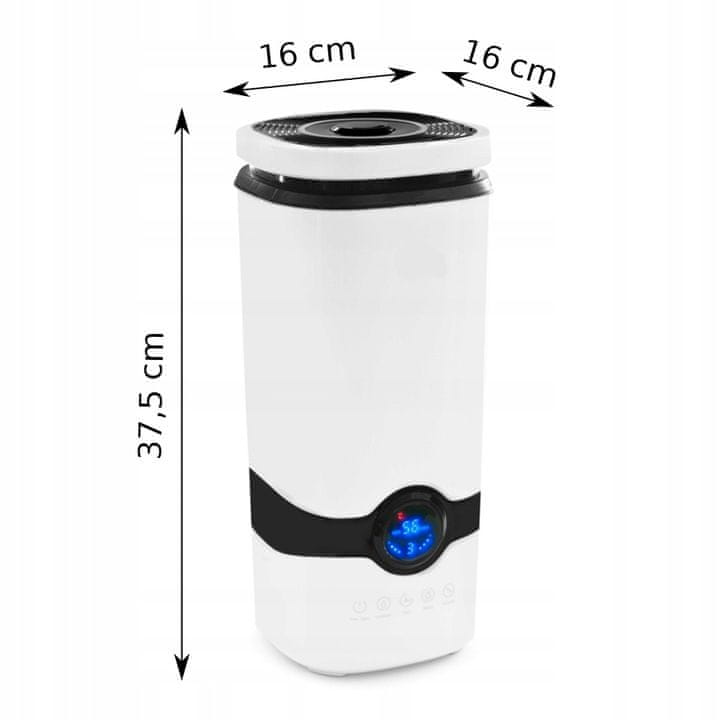 - SPECIFIKACIJA – Bijela boja; materijal: plastika; snaga: 28W; volumen: 20m2; kapacitet spremnika: 4l; učinkovitost: 300ml/h; ionizator: DA; higrostat: DA; mjerač vremena: DA; dodirna ploča: DA; uključen daljinski upravljač: DA; noćni način rada: DA; promjena intenziteta pare: DA; režim konstantne vlažnosti: DA; ulja u setu: 3; dimenzije: 14/14/37 cm; težina: 0,950 kg