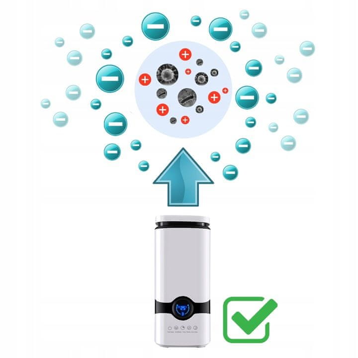 - IONIZATOR – smanjuje nam štetne ione (pozitivne ione) proizvodeći negativne ione – sva onečišćenja padaju na pod umjesto da putuju u naša pluća; zrak postaje lagan i svjež, i tako? Naše raspoloženje se trenutno popravlja! Ne osjećamo se stalno umorno, pospano i sl. Ionizator će biti izvrsno rješenje posebno za alergičare, astmatičare, kao i za osobe koje se žale na stalne glavobolje. Zrak koji udišemo vrlo je štetan za naše zdravlje, utječe na cijelo tijelo i odgovoran je za stanje naše kože, kose i pluća. Najopasnije je sve što nije vidljivo prostim okom – prašina i grinje, malo nas zna da su električni uređaji (telefon, TV, računalo, mikrovalna pećnica, perilica i mnogi drugi) veliki problem, pozitivni ioni proizvode negativno utječe na naš organizam, zato je jako važno sebi i svojoj obitelji osigurati siguran i zdrav zrak koji osigurava ionizator – na kvalitetu vanjskog zraka ne možemo utjecati, ali zrak koji udišemo kod kuće može biti uvelike promijenio ovlaživač zraka s funkcijom ionizacije. Uređaj ima i funkciju aromaterapije.