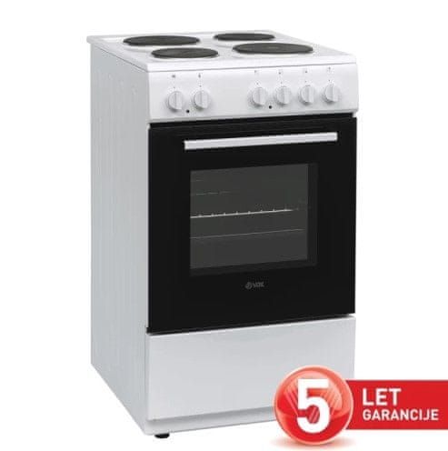 Električni štednjak ima četiri zone za kuhanje i električnu pećnicu kapaciteta 55 litara. Pripada energetskom razredu A. Elegantno dizajniran štednjak opremljen je indikatorima za rad pećnice i polja za kuhanje. Glatka emajlirana površina ploče omogućuje jednostavno čišćenje.