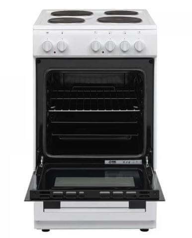 Smješten je u energetski razred A. Štednjak se može pohvaliti 4 električne ploče za kuhanje. Dvije površine za kuhanje imaju promjer 180 mm i 2 145 mm. Ispod je ventilatorska pećnica kapaciteta 55 litara. S dva poslužavnika moći ćete istovremeno peći veće količine posuđa.