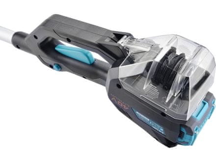 - Pogumovaná rukojeť brání vysmeknutí, tlumí vibrace a zpříjemňuje držení při práci, je v ní také vložena náhradní cívka se strunou