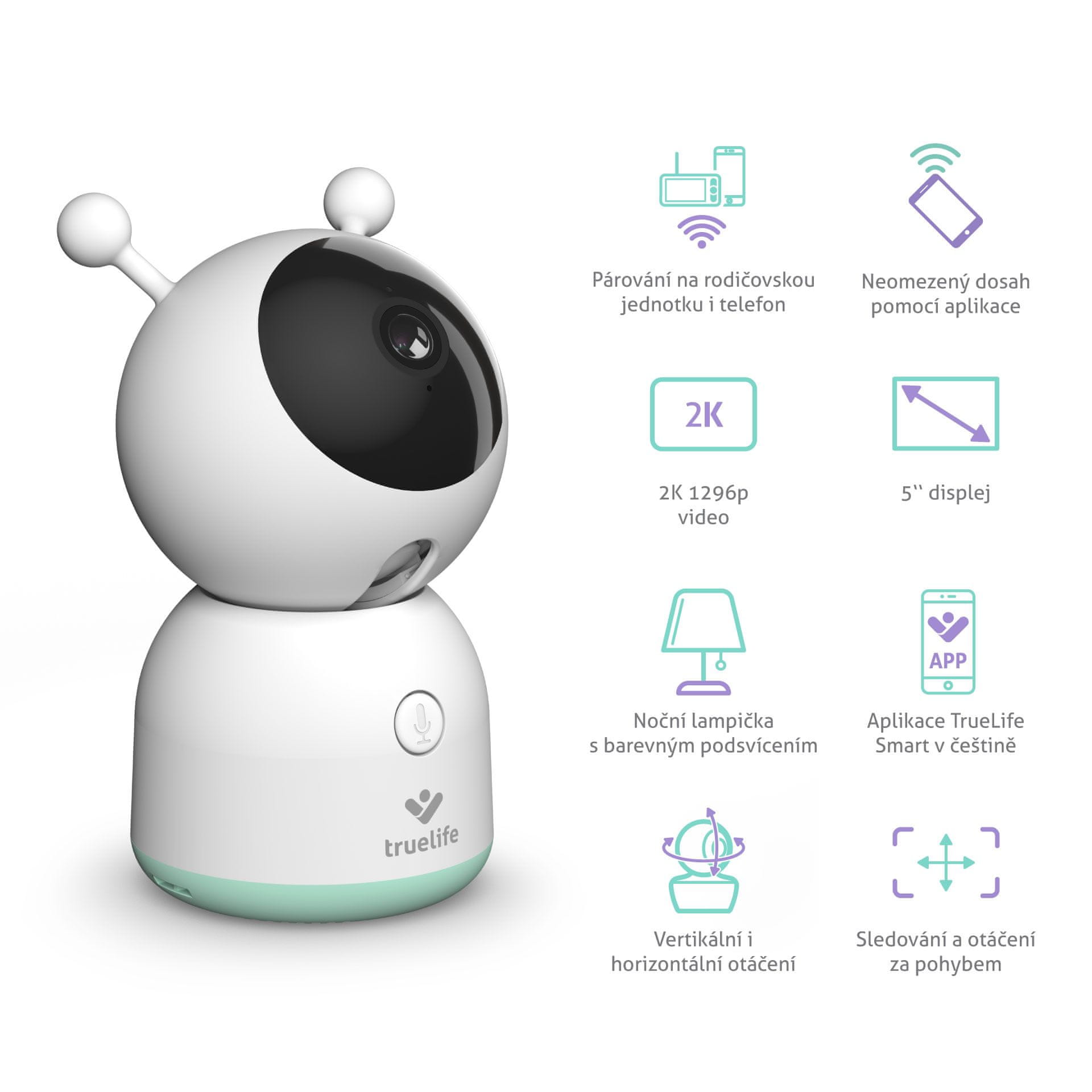 Oblik rotirajućeg baby monitora savršen je za dječju sobu – ne smeta djetetu, ali ga može utješiti. Može puštati zbirke, oponašati otkucaje srca ili, zahvaljujući mogućnosti dvosmjerne komunikacije, možete umiriti bebu vlastitim glasom. Mirnom snu doprinosi i bojno osvjetljenje u cijelom spektru i brojni efekti. Prilagodljivo univerzalno pristajanje omogućuje mnoge mogućnosti postavljanja baby sittera. Paket uključuje komplet za zidnu montažu, ali također možete kupiti posebni TrueLife NannyCam držač za pričvršćivanje baby monitora na okvir krevetića, na primjer. Ako je potrebno, možete spojiti drugu kameru na roditeljsku jedinicu ili čak do 16 kamera u aplikaciji.