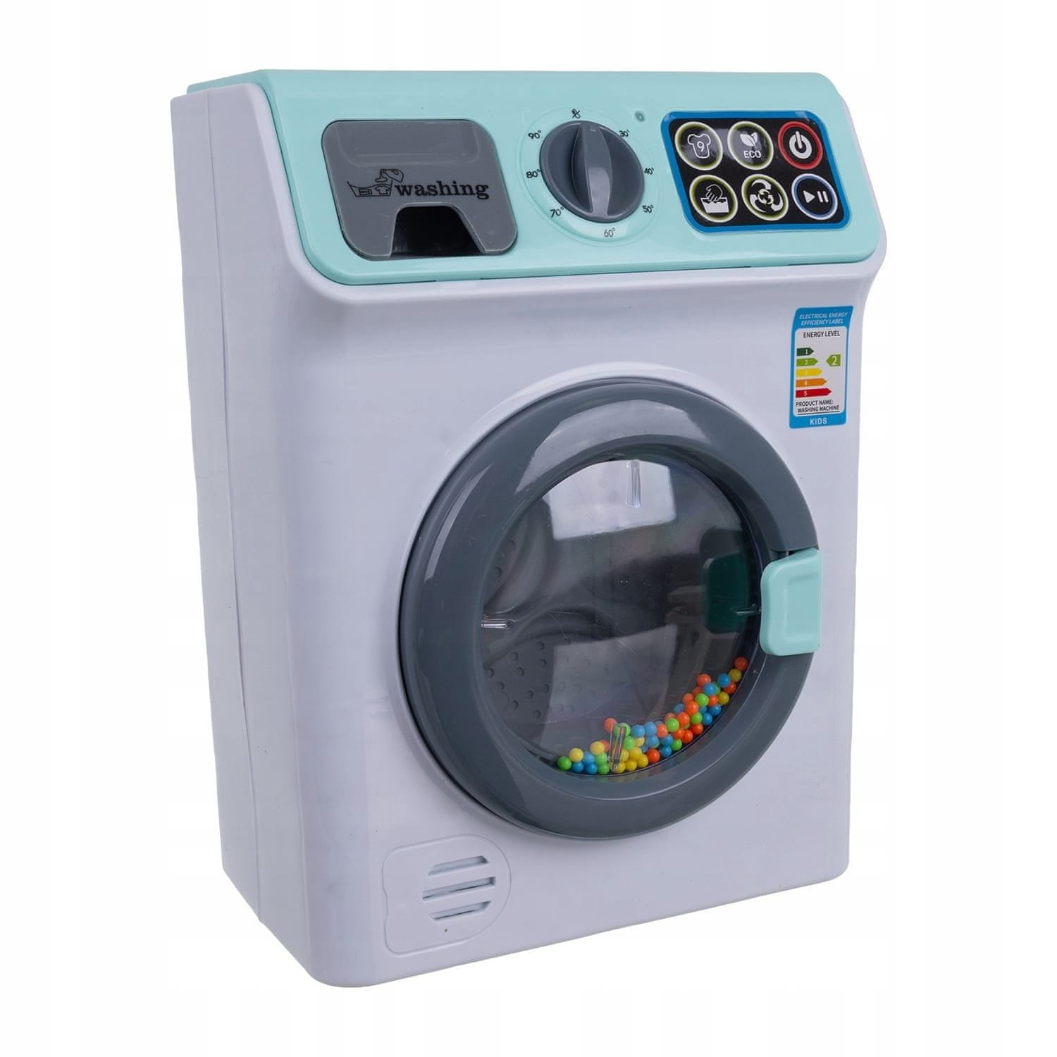 odpirajoča se vrata, vrteči se boben s kroglicami, gumb za nastavitev temperature, plošča z gumbi, predal za detergent in zvočni učinki.