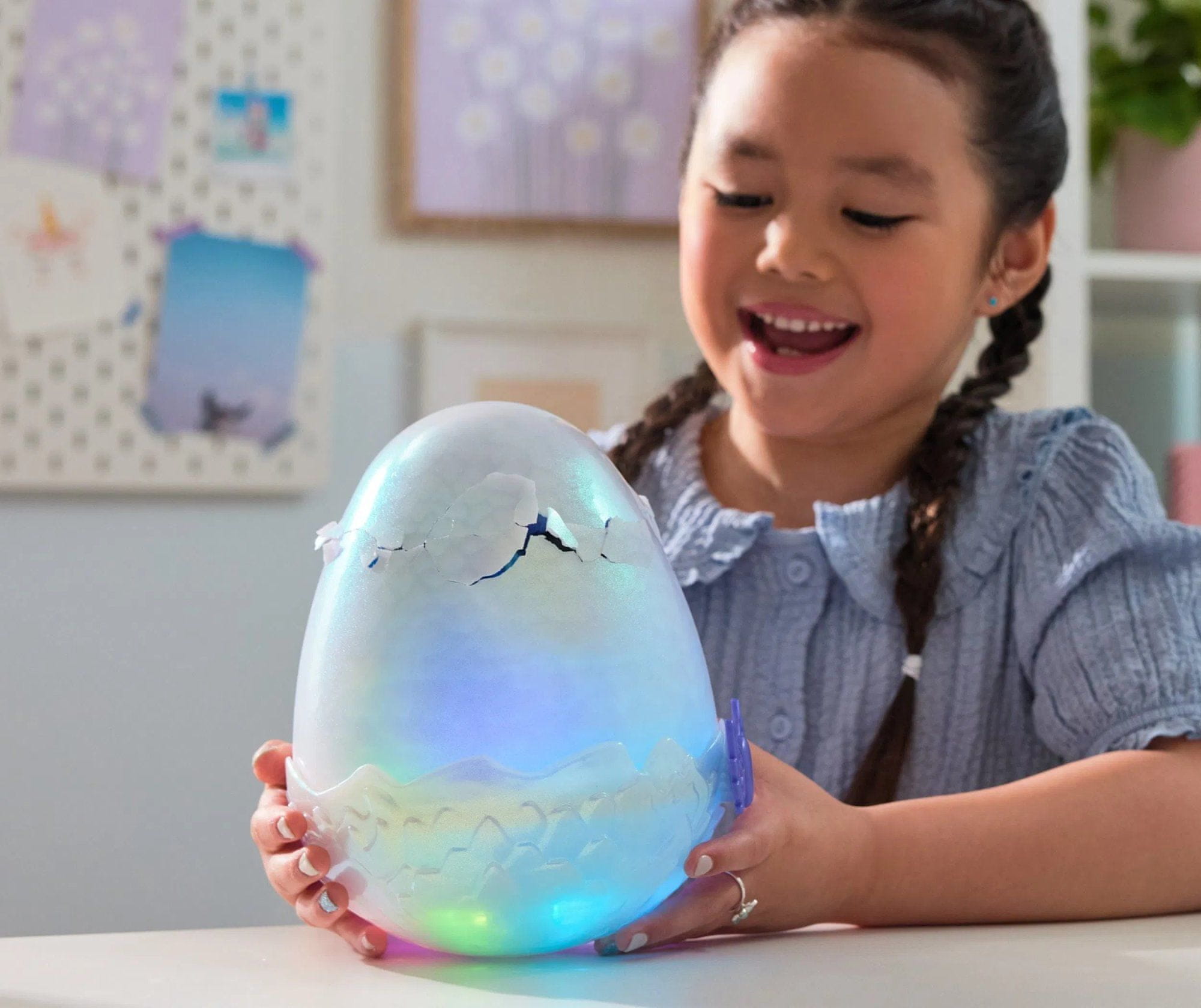 Plišana igračka Hatchimals Big Egg Draggle treba puno ljubavi i njege da bi oživjela. Milujte, kuckajte, podižite i ljuljajte jaje – čut ćete kako vaš ljubimac Hatchimal odgovara na vašu ljubav. Čarobna maglica stvara iščekivanje i uzbuđenje dok jaje svijetli u duginim bojama.