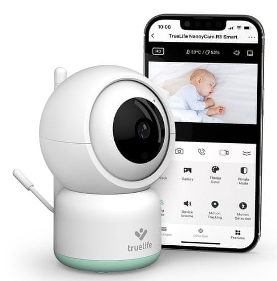 Rotirajuća elektronička dadilja TrueLife NannyCam R3 Smart može pratiti kretanje i okretati se za njim. Istodobno, njegova širokokutna leća vidi u svim kutovima i automatski aktivira noćni vid u mraku. Domet elektroničke dadilje je neograničen zahvaljujući internetskoj vezi, a u trenutku kada isključite zaslon telefona, on sam definitivno ne spava. Snima svaki pokret i zvuk i šalje vam obavijest na vaš telefon. Također može postavljati 24/7 snimke na SD karticu.