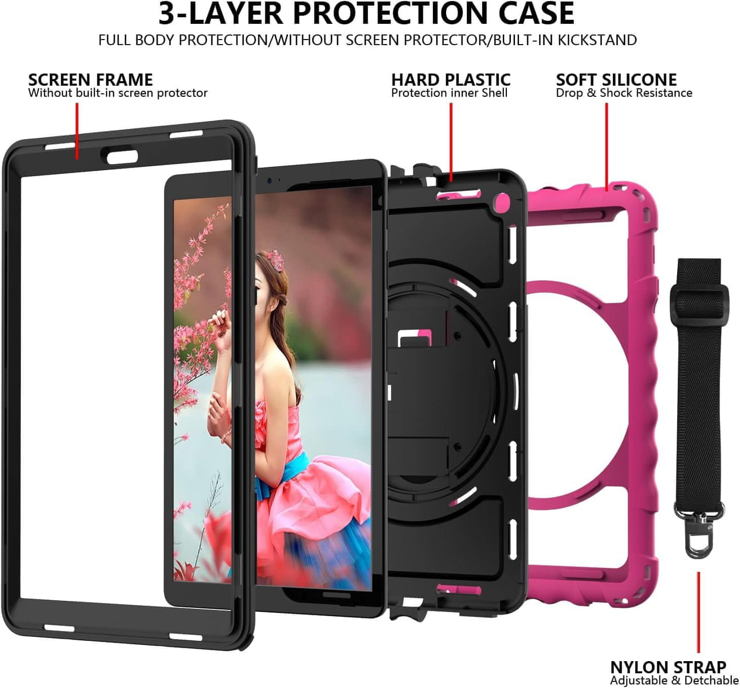 Ova futrola pruža vašem uređaju najvišu razinu zaštite. Sastoji se od tri sloja: plastičnog kućišta od PC materijala i meke silikonske stražnje strane, koja štiti tablet od ogrebotina, udaraca i vibracija tijekom svakodnevne upotrebe. Ova praktična futrola ima ugrađeno, sklopivo postolje koje se okreće za 360°, pružajući više kutova korištenja, što čini njenu upotrebu još udobnijom. Precizno izrađeni izrezi osiguravaju savršeno pristajanje uz priključke i jednostavan pristup svim gumbima. Futrola je također opremljena podesivim i odvojivim remenom za rame, što osigurava maksimalnu prenosivost, bez obzira gdje se nalazite. Zahvaljujući ovom svestranom kućištu, vaš će uređaj biti siguran tijekom planinarenja, izleta i drugih aktivnosti na otvorenom.