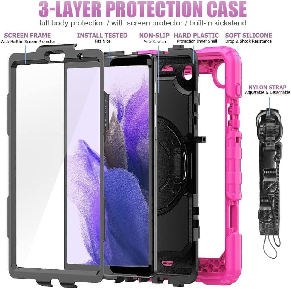 Ovo maskica pruža vašem uređaju visoku razinu zaštite. Sastoji se od tri sloja: plastičnog kućišta od PC-a i meke silikonske stražnje strane, što štiti tablet od ogrebotina, udaraca i vibracija tijekom svakodnevne upotrebe. Ovo praktično maskica ima ugrađeni, sklopivi stalak koji se okreće za 360°, nudeći više kutova korištenja, što čini njegovu upotrebu još udobnijom. Precizno izrađeni izrezi osiguravaju savršeno pristajanje priključcima i jednostavan pristup svim gumbima. Maskica je također opremljeno podesivim i odvojivim remenom za rame, što osigurava maksimalnu prenosivost, bez obzira gdje se nalazite. Zahvaljujući ovom svestranom kućištu, vaš će uređaj biti siguran tijekom planinarenja, izleta i drugih aktivnosti na otvorenom.