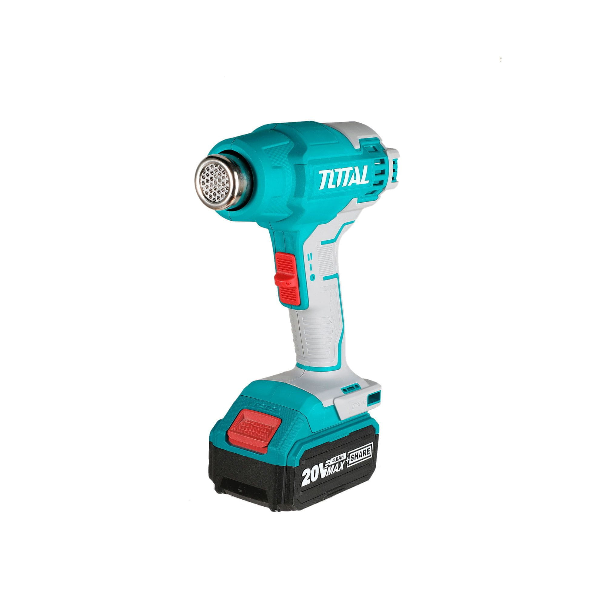 Akumulatorska toplinska pištolja (fen) TOTAL TBLI20025 namijenjena je obavljanju radova gdje je potrebno visoko temperaturno djelovanje. S njom možete ukloniti staru boju, zagrijati površinu, omekšati lijepljene spojeve, zagrijati toplinski skupljive cijevi itd. Snažan motor omogućava postizanje maksimalne učinkovitosti. Model ima dva načina podešavanja protoka zraka (100/200 l/min) i temperature (300/550 °C), što omogućava izvođenje različitih zadataka ovisno o vrsti površine i željenom rezultatu. Akumulatorski fen može se koristiti i u fiksnom položaju – za to je osigurana potporna površina. Ova građevinska fen je dio obitelji TOTAL i stoga je kompatibilna sa svim baterijskim platformama. Ovisno o zadacima i potrebama, moguće je posebno kupiti baterije potrebne kapacitete. Komplet TBLI20025 uključuje i tri nastavka, akumulatorsku bateriju i punjač. Plastični kovčeg osigurava jednostavno pohranjivanje i prenošenje alata.