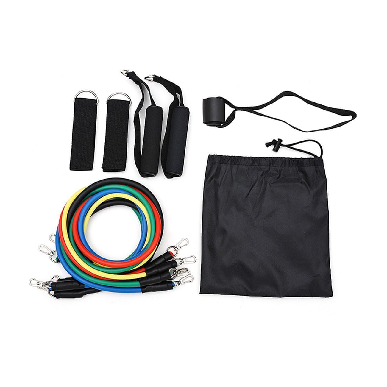 Set za kućni mini fitnes studijo. U setu: 1 set traka otpora (11 kom), 1 jednostruki AB kotač, 1 podloga, 1 set šipki za sklekove, 1× uže za preskakanje, 1× stiskač za šaku. Materijal izrade: metal, EVA pjena, razno. Podloga: 17 × 34 cm. Cijeli opis
