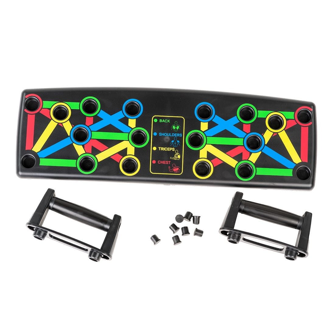Push up board za sklekove omogućava trening snage gotovo cijelog tijela, a kako bi sve bilo jednostavnije, ploča je označena različitim bojama, te svaka boja pogađa bolju aktivaciju određenih mišićnih skupina. Drugim riječima, plava boja – prsa, crvena boja – ramena, žuta boja – leđa i zelena boja – triceps.