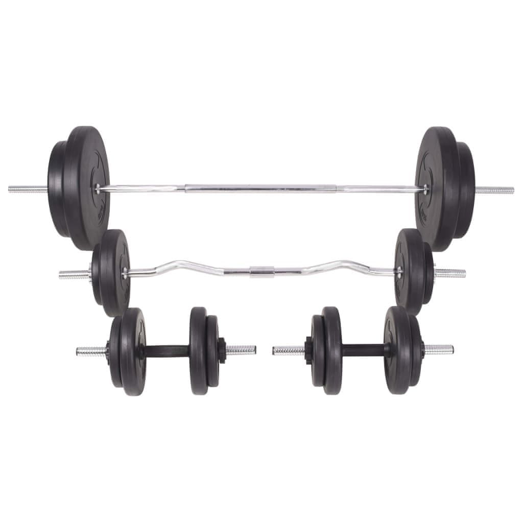 Ovaj univerzalni set šipki i utega savršen je za prsa, bicepse, ruke, tricepse i leđne mišiće. Uključuje dvije ploče od 15 kg, dvije ploče od 10 kg, dvije ploče od 5 kg, četiri ploče od 2,5 kg, šest ploča od 1,25 kg, dvije velike i dvije male šipke te ima ukupnu težinu od otprilike 90 kg.