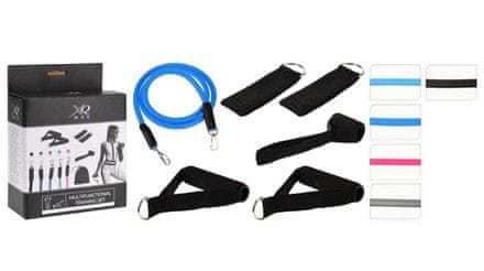 - podesivi gumeni ekspander XQMAX s priborom – set sadrži ukupno 11 dijelova: – 5 x gumeni ekspander s različitim otporom – 2 x ručke za jednu ruku – 2 x remen za gležanj – sidro za vrata -.