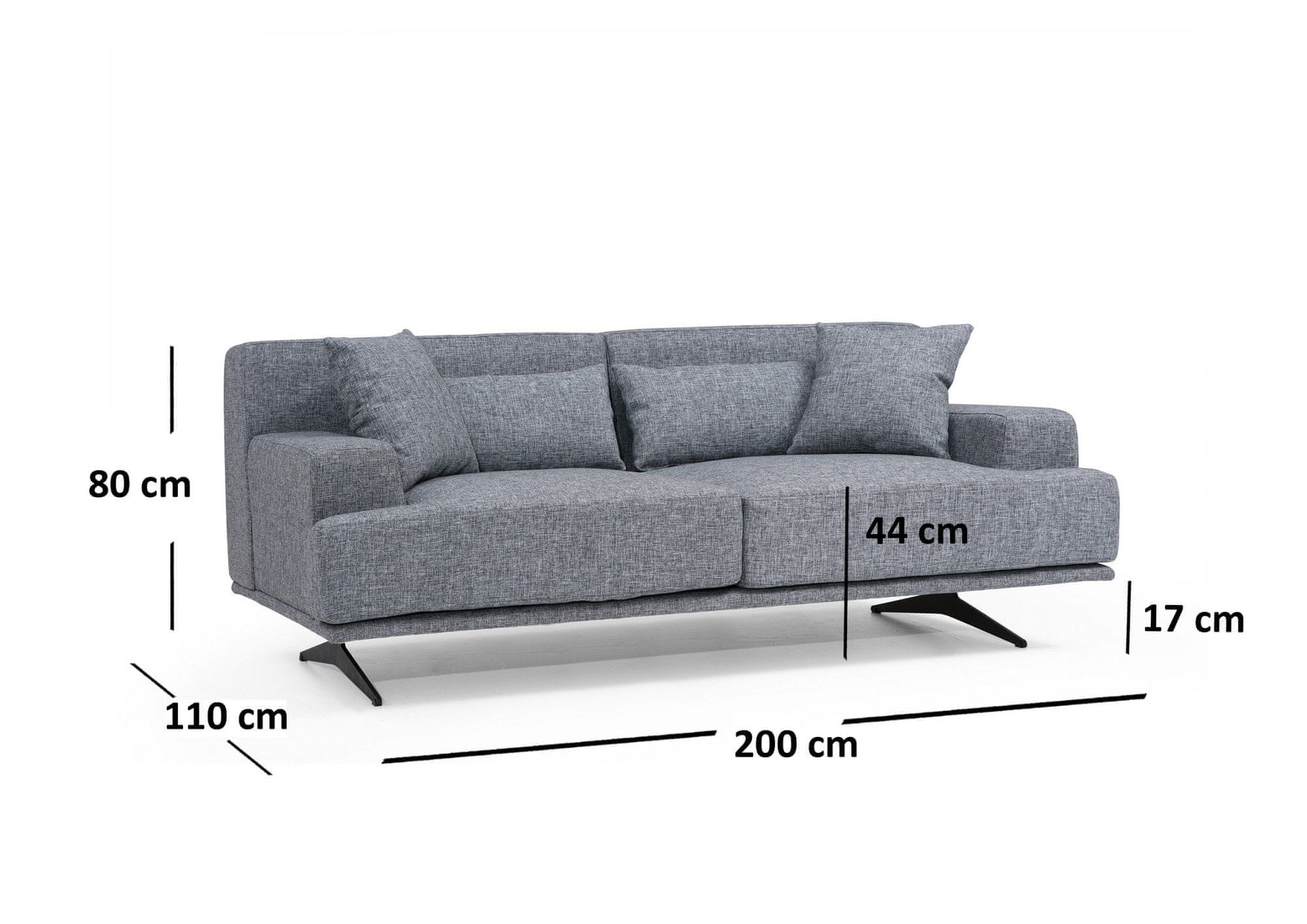 Moderan i elegantan dvosjed daje prostoru posebnu draž i poziva na opuštanje. Konstrukcija garniture izrađena je od drveta, dok je tkanina 100% poliester. Dvosjed je na sjedištima punjen 28 DNS spužvom i oprugom na sjedištima. Naslon je punjen spužvom 24 DNS. Dvosjed uključuje i 4 jastuka punjenih spužvom i silikonom. Ima mat crne metalne noge. Navlake se mogu kemijski očisiti. Dimenzije: 200 cm x 110 × 80 cm. Dimenzije jastuka: 45 × 45 cm (2 komada), 65 × 32 cm (2 komada). Pakiranje u 2 paketa.