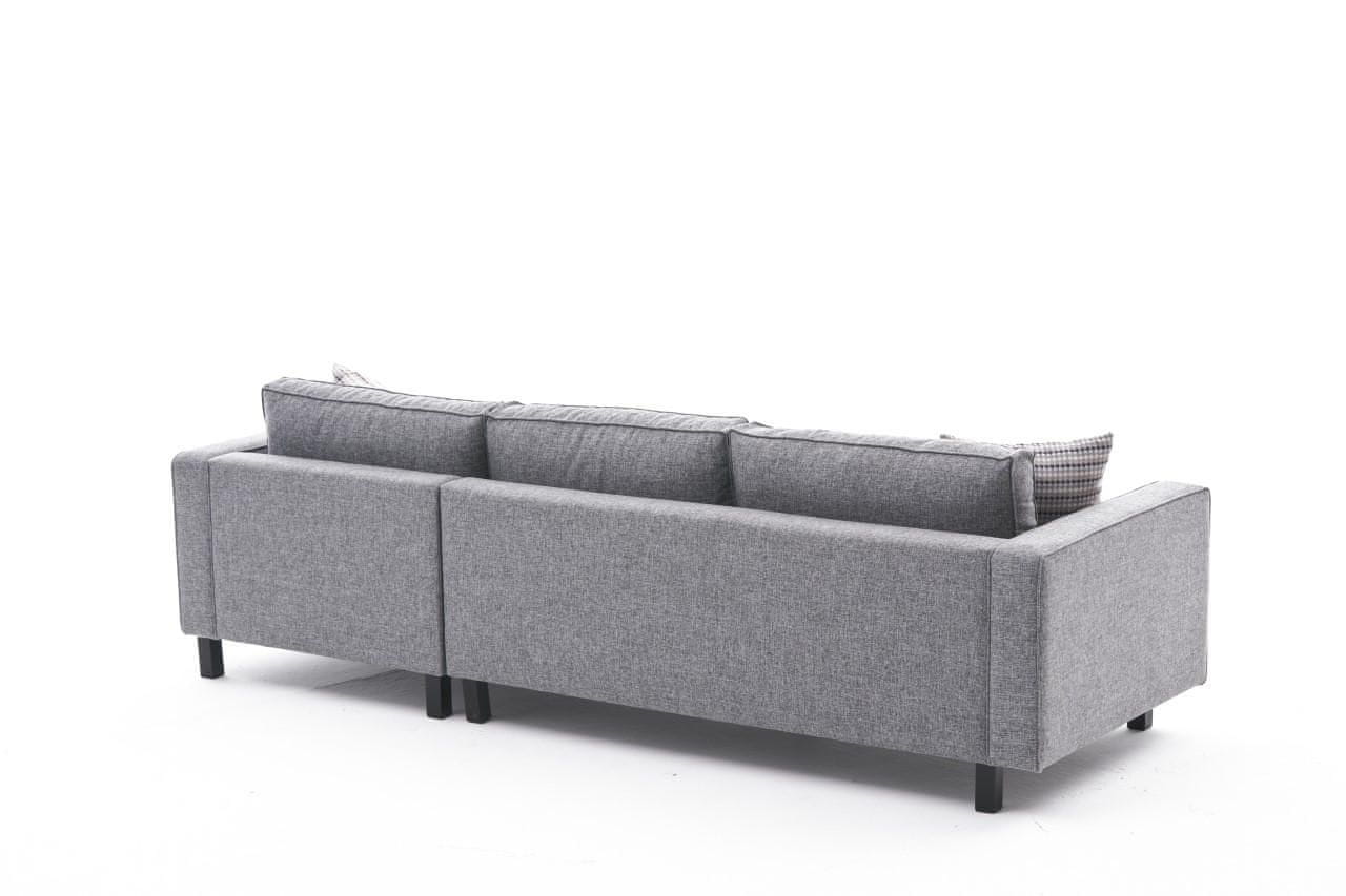 Okvir: BUKVA DRVO Tkanina: 100% POLIESTER-LAN Širina: 258 cm Visina: 83 cm Dubina: 181 cm Dužina sjedala: 181 cm Visina leđa: 43 cm Dubina sjedala: 60 cm Visina sjedala: 40 cm Debljina ruke: 14 cm Visina nogavice: 13 cm Unutarnja debljina (bez krakova): 230 × 145 cm Dubina ležanja: 145 cm 28 DNS pjena za sjedenje (15 cm) Ispuna od vlakana u jastucima Noge od bukovog drveta, Broj paketa: 2 Veličina: 182 × 92 × 52 cm – 38,5 kg (1 komad) Veličina: 168 × 92 × 52 cm – 37,5 kg (1 komad)
