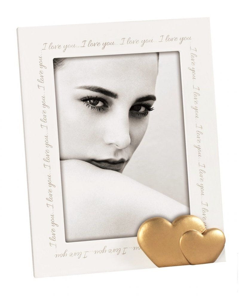 Visokokvalitetni drveni okvir za fotografije dimenzija 13×18cm talijanske tvrtke Mascagni.Primjena dva srca u zlatnoj boji na donjoj traci. Pakirano u poklon kutiju. Za portretno stajanje.