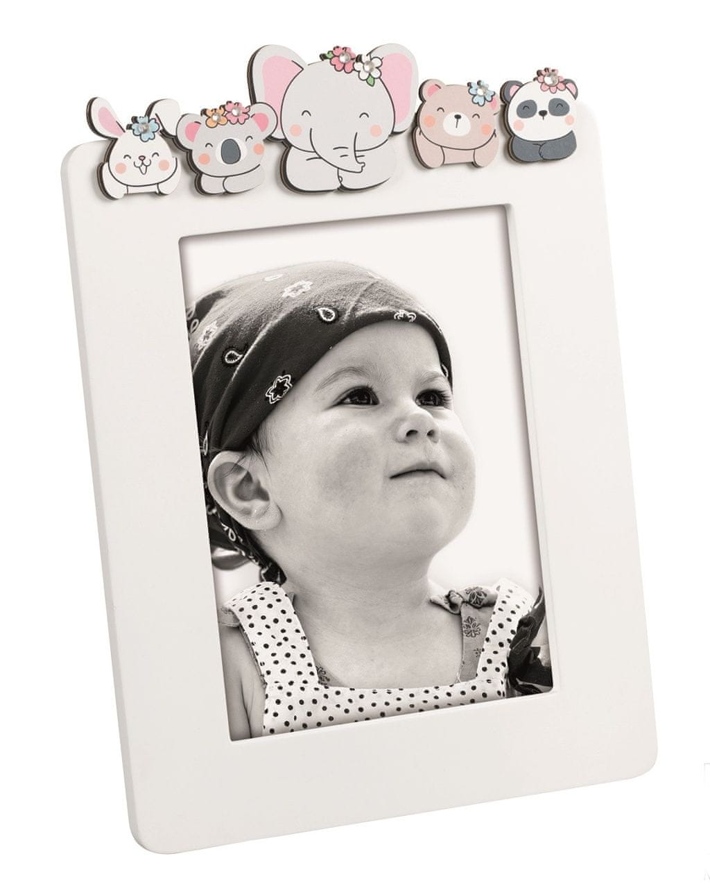 MDF okvir za fotografije talijanske tvrtke Mascagni Casa. Veličina fotografije 13×18, boja bijela. Dječji dizajn sa životinjskim aplikacijama s kamenčićima na gornjoj šini okvira. Pakiranje u poklon kutiji. Prikladno samo za stajanje.