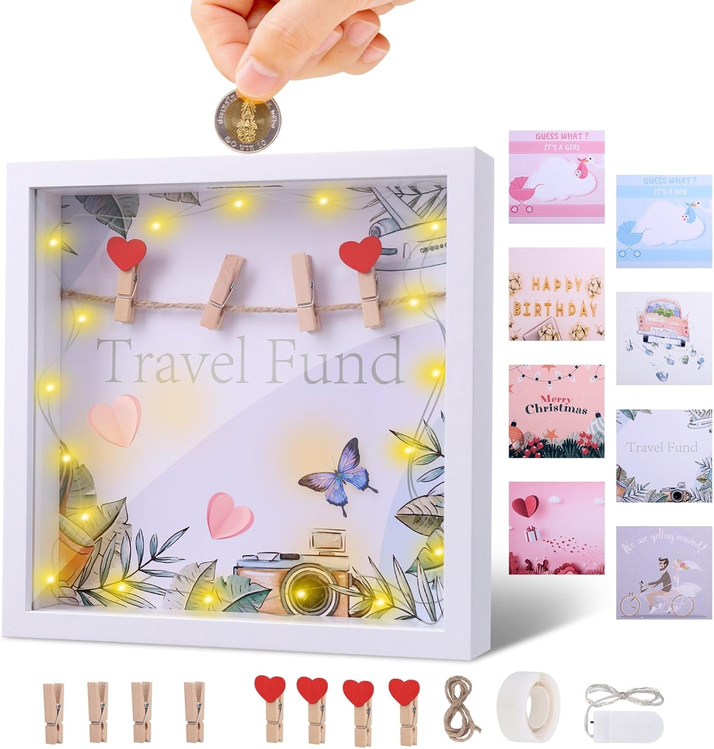 Nikcorp JIZZU 3D okvir za slike sa spremnikom 2u1, drveni za uspomene, s LED svjetlima i 8 pozadina, 22x22 cm