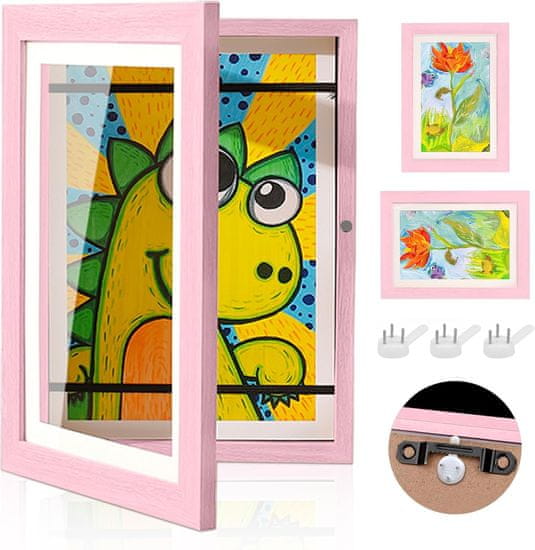 Drveni okvir za slike A4 (32×24 cm), ružičasti. Savršen za dječje crteže i uspomene! Jednostavna izmjena slika zahvaljujući magnetskom zatvaraču. Siguran, izdržljiv i elegantan dodatak svakom interijeru.