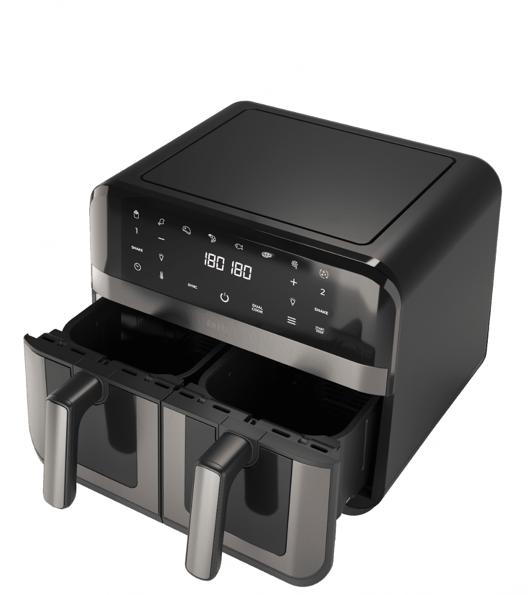 Uživajte u zdravijem načinu kuhanja uz AIWA FUTAGO AFR-9000, cvrtnik na vrući zrak koji kombinira dvostruku košaru s naprednim funkcijama za maksimalnu fleksibilnost. S ukupnim kapacitetom od 9 litara (2×4,5 L), možete istovremeno pripremati dvije različite vrste jela – s različitim temperaturama i vremenom kuhanja.