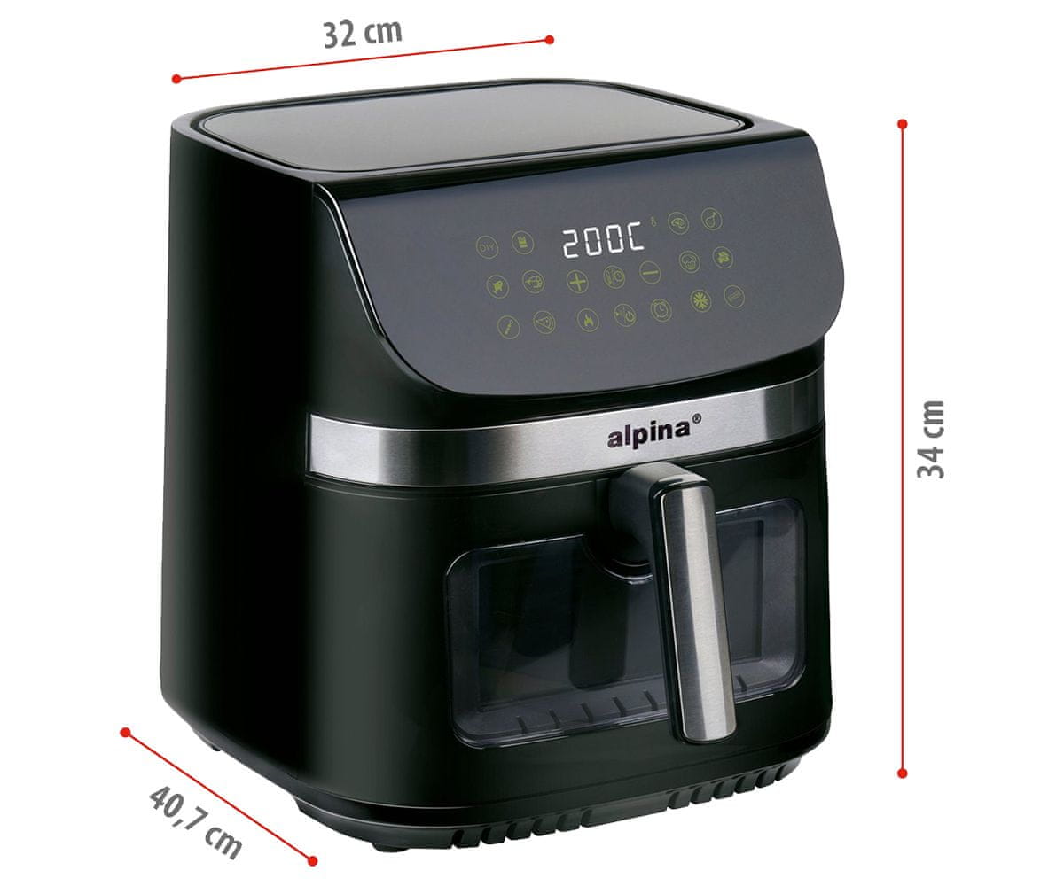 Friteza ALPINA XXL 9L novost je na tržištu friteza, jer se odlikuje izuzetnim digitalnim ekranom osjetljivim na dodir! Uz najnoviju tehnologiju prženja na vrući zrak bez upotrebe ulja vaša će hrana biti zdravija i skuhana brže nego s drugim uređajima za pripremu hrane. Okus hrane dobiva potpuno novu dimenziju prženjem, pečenjem i kuhanjem vaših omiljenih jela, a hrana sadrži i do 80% manje masnoće.