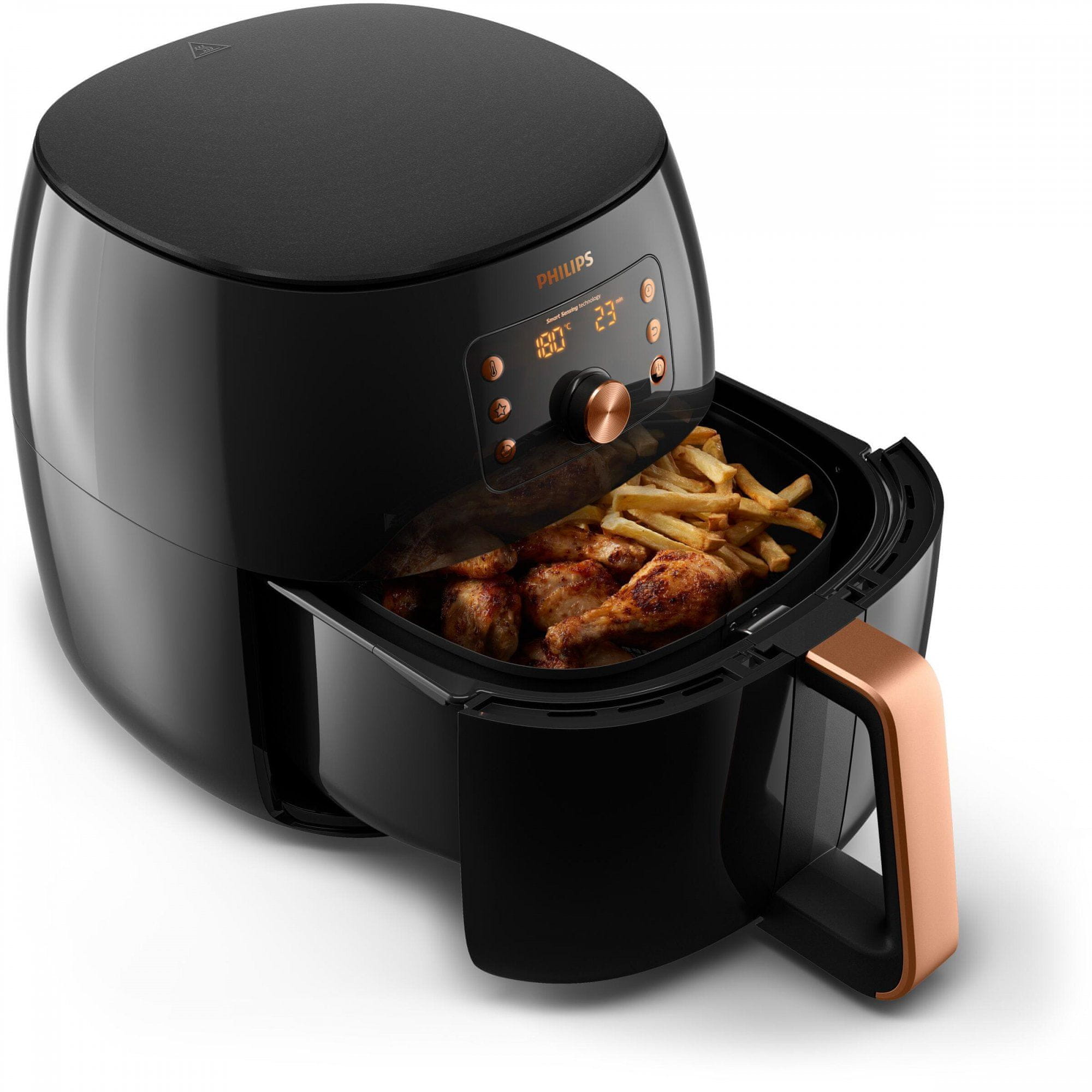 Friteza na vrući zrak s XXL košaricom obujma 7,3 l priprema obilje ukusne hrane uz manje masnoće. Inovativna tehnologija Rapid Air stvara iznimno brz protok zraka koji precizno priprema i hrskavo peče svako jelo. Dno jedinice je posebno dizajnirano u zvjezdastom obliku koji uklanja višak masnoće. Može se pohvaliti s pet unaprijed zadanih programa rada koje odaberete jednim pritiskom, a aparat zatim kreće s pripremom jela. Osim toga, opremljena je pametnim senzorom koji detektira težinu sastojaka i prilagođava temperaturu i vrijeme kuhanja za najukusnije rezultate. Također, ima praktičnu funkciju podgrijavanja ili poseban način rada održavanje temperature koji održava hranu toplom do 30 minuta.