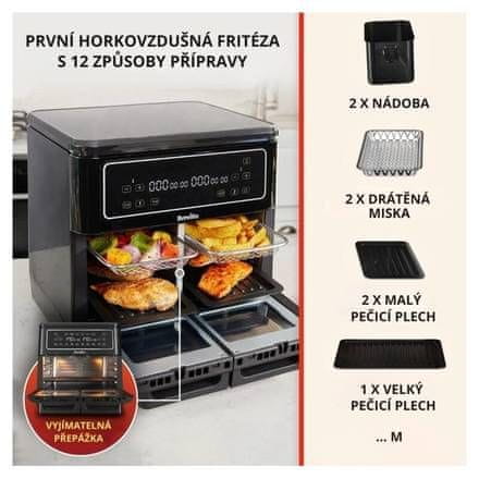 Breville VDF130X-01 je friteza na vrući zrak Halo Flexi s dvije zone velikog kapaciteta i ukupnim kapacitetom od 11 litara. Omogućuje vam istovremeno kuhanje dva jela u odvojenim komorama ili jednoj velikoj komori nakon uklanjanja pregrade. Nudi širok raspon mogućnosti pripreme hrane – od prženja u dubokom ulju, preko roštiljanja, pečenja do zagrijavanja.
