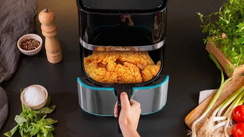 Cecotec Cecofry Full InoxBlack 5500 Pro friteza na vrući zrak moderna je friteza na vrući zrak za one koji žele jesti zdravije bez žrtvovanja okusa. Zahvaljujući tehnologiji vrućeg zraka, možete pripremiti hrskave krumpiriće, sočnu piletinu ili povrće s minimalnom masnoćom – brzo, praktično i bez kompromisa. Prednosti: – Veliki kapacitet od 5,5 litara – pripremite obrok za cijelu obitelj odjednom, bez potrebe za ponavljanjem ciklusa. – Visoka snaga od 1700 W – brzo zagrijavanje i skraćeno vrijeme kuhanja, idealno za svakodnevne žurbe. – PerfectCook tehnologija – ravnomjerno zapeče hranu zahvaljujući cirkulaciji vrućeg zraka. – 8 automatskih programa – lako pripremite krumpiriće, meso, ribu ili povrće bez nagađanja. – Raspon temperature od 80°C do 200°C – precizna kontrola toplinske obrade raznih jela. Intuitivna ploča osjetljiva na dodir – jednostavno i korisničko rukovanje, čak i za rijetke kuhare. Kućište od nehrđajućeg čelika – izdržljivo i lako se čisti, dobro izgleda u svakoj kuhinji. Eko način rada – energetski učinkovita priprema hrane uz održavanje visoke učinkovitosti. Zdravo kuhanje bez ulja – tehnologija vrućeg zraka. Cecotec Cecofry Full InoxBlack 5500 Pro je friteza na vrući zrak koja koristi vrući zrak umjesto ulja. To hranu čini hrskavom izvana i sočnom iznutra, a sadrži manje masnoće. Izvrsna je alternativa tradicionalnom prženju – idealno za one koji brinu o svom zdravlju i prehrani. Kapacitet 5,5 litara – kuhanje za cijelu obitelj. Friteza Cecotec Cecofry Full InoxBlack 5500 Pro ima veliku košaru od 5,5 litara, što vam omogućuje pripremu većih količina hrane odjednom. To je praktično rješenje za obiteljske večere, druženja s prijateljima ili brzi obrok nakon posla – bez potrebe za dijeljenjem vremena kuhanja u serije. Friteza od 1700 W – brza i učinkovita. Sa snagom od 1700 W, uređaj se brzo zagrijava i brzo priprema hranu. To ne samo da skraćuje vrijeme kuhanja, već i čuva više hranjivih tvari – idealno rješenje za zaposlene i nestrpljive ljude. Tehničke specifikacije: