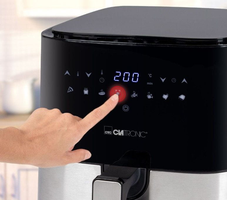 Clatronic friteza na vrući zrak ima moderni dizajn s prednjom pločom od nehrđajućeg čelika. Košara od 5 l s neprianjajućim premazom omogućuje brzu i jednostavnu pripremu velikih količina hrane. Cirkulacija zraka od 360 º priprema ukusno hrskave obroke bez dodatnog ulja. Možete birati između osam automatskih programa kuhanja** za različite sastojke ili sami prilagoditi temperaturu kuhanja između 80 i 200 ºC. Nudi jednostavno upravljanje na dodirnoj ploči. Automatsko isključivanje i zaštita od pregrijavanja osiguravaju sigurnost. Ručka koja se ne zagrijava osigurava sigurno rukovanje.