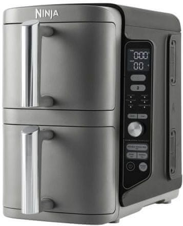 Ninja SL400EU Double Stack XL 9.5L je friteza na vrući zrak s dvije ladice („friteza bez ulja“) koja vam omogućuje istovremeno kuhanje dvije neovisne serije. Svaka ladica ima volumen od 4,75 L, tako da je ukupni kapacitet od 9,5 L, pogodan za srednja i velika kućanstva. Zahvaljujući vertikalnom rasporedu ladica (Stacked Drawers), zauzima manje prostora na radnoj površini od klasičnih friteza na vrući zrak s dvije košare postavljenih jedna pored druge. Ima više unaprijed postavljenih načina kuhanja i mogućnost sinkronizacije završetka kuhanja obje ladice.