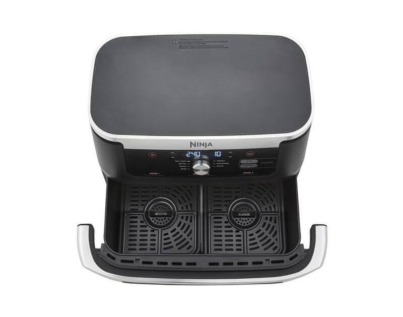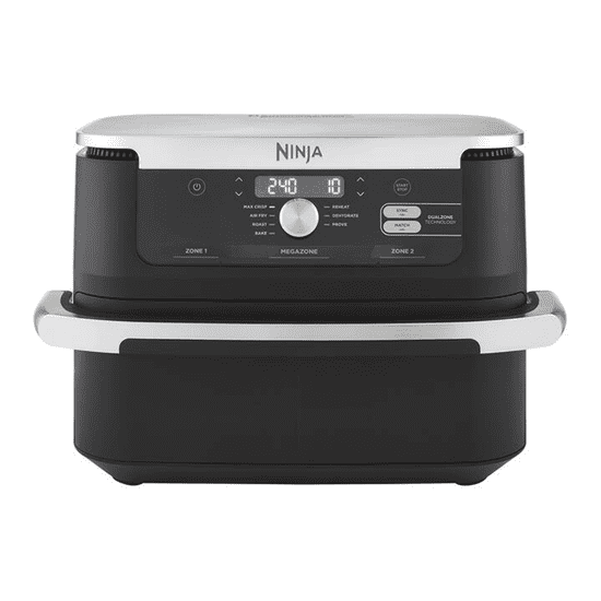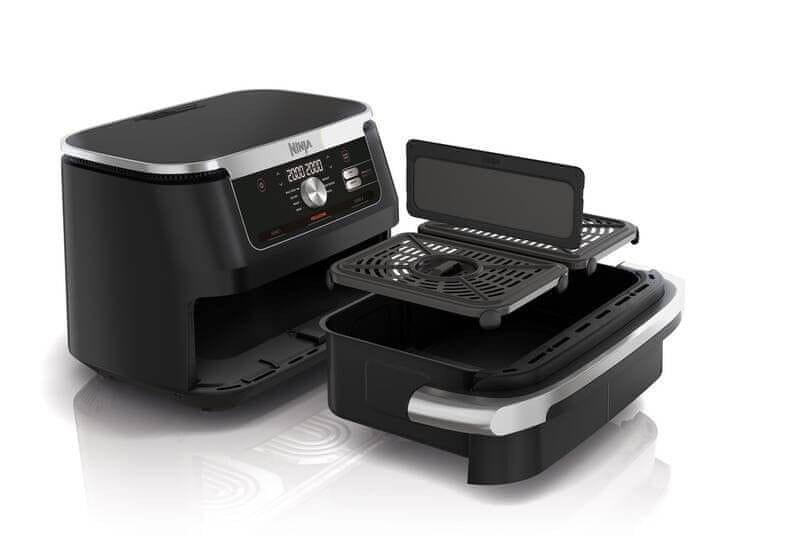 Zračna friteza Ninja Foodi FlexDrawer AF500EU u elegantnoj crno-srebrnoj izvedbi idealan je pomoćnik za brzu i zdravu pripremu hrane. Zahvaljujući inovativnom sustavu FlexDrawer možete koristiti dvije neovisne zone kuhanja zapremine 5,2 l svaka ili ukloniti pregradu i stvoriti jednu veliku MegaZone zapremine 10,4 l za pripremu većih jela. Tehnologija Dual Zone omogućuje istovremeno kuhanje dvaju jela s različitim funkcijama, temperaturama i vremenima – oba jela bit će gotova u isto vrijeme zahvaljujući funkciji SYNC. Friteza nudi 7 funkcija kuhanja (Air Fry, Max Crisp, pečenje, roštiljanje, podgrijavanje, sušenje i dizanje tijesta) s rasponom temperature od 40 do 240 °C. Pripremajte jela uz do 75 % manje masnoće nego kod tradicionalnog prženja i do 65 % brže nego u klasičnoj pećnici. Svi odvojivi dijelovi imaju neljepljivu površinu i prikladni su za pranje u perilici posuđa.
