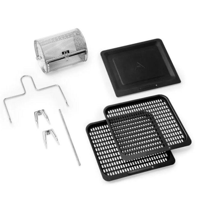- Uključeno 6 dodataka: 2 protvane, pladanj za sakupljanje ulja, izvlačenja hvataljke, 2,9-litarska rotirajuća okrugla košara i kuku za pečenje.
