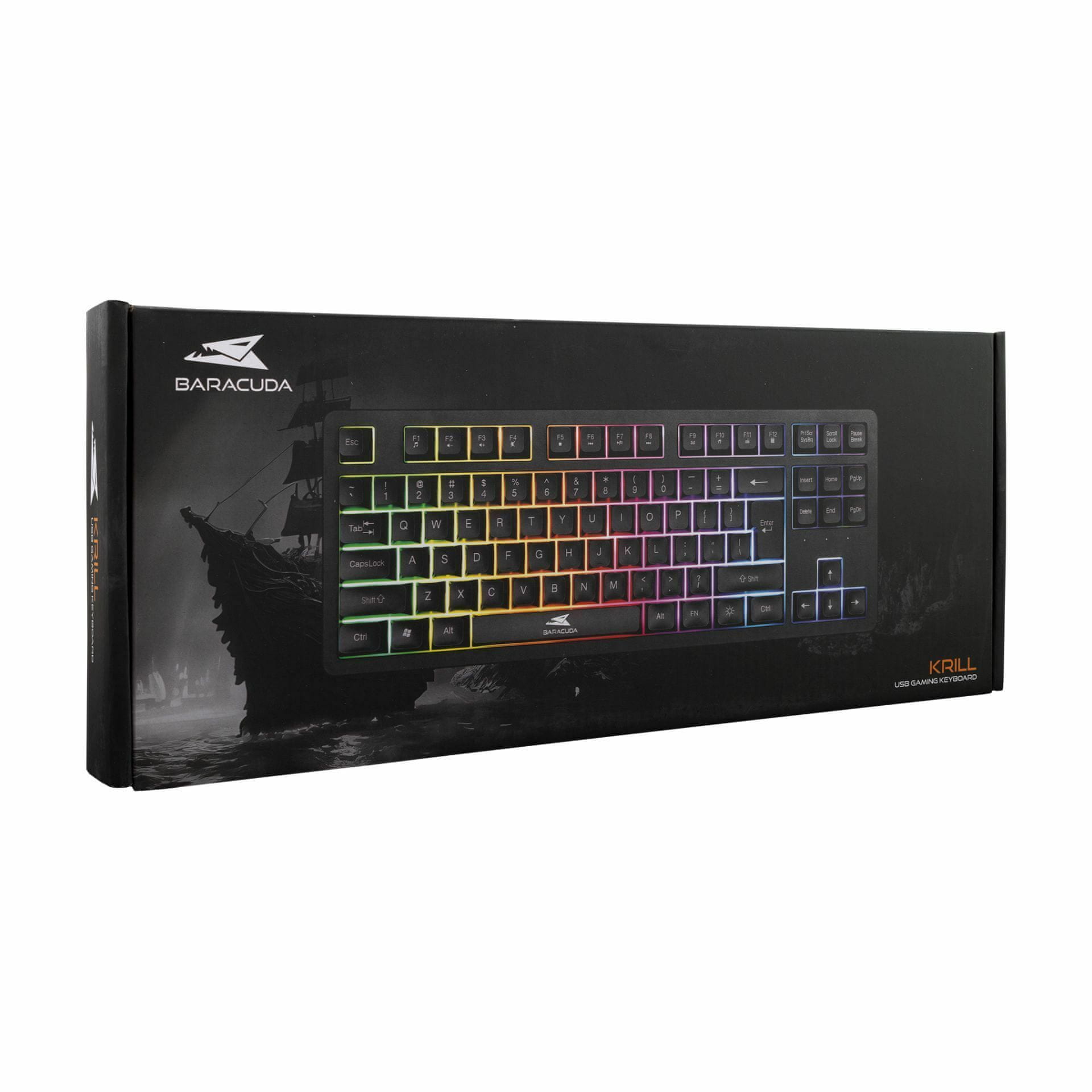 Iskusite vrhunsku igru s tipkovnicom Baracuda KRILL GAMING. S 87 tipki i anti-ghosting zaštitom osigurava precizno pritiskanje tipki. Elegantan crni dizajn s RGB pozadinskim osvjetljenjem dodaje dodir elegancije. Kompatibilno s Windows, Mac i Chrome OS operativnim sustavom.