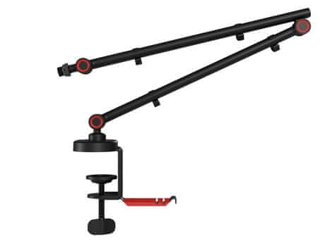 Držač, pričvršćen na podnožje kraka mikrofona s dva vijka za savršenu stabilnost , pruža namjensko mjesto za vaše slušalice, koje više ne moraju zauzimati prostor na vašem stolu ili policama. Držač ima dodatna 2 utora za kabele, što vam omogućuje istovremeno usmjeravanje kabela mikrofona i slušalica . Podesivi crni krak mikrofona s crvenim detaljima i držačem za slušalice dizajnirani su za optimalno pozicioniranje i udobnost.